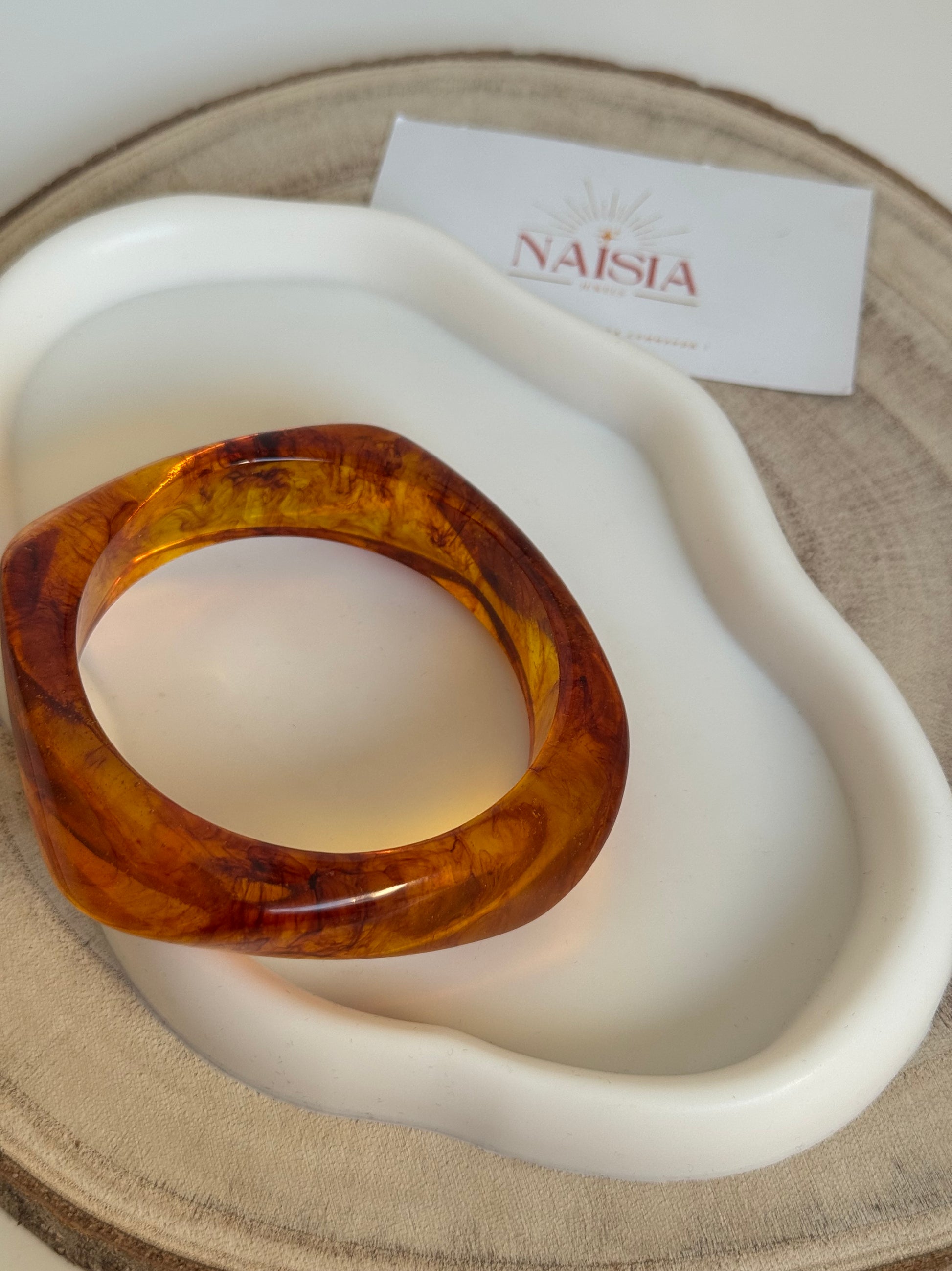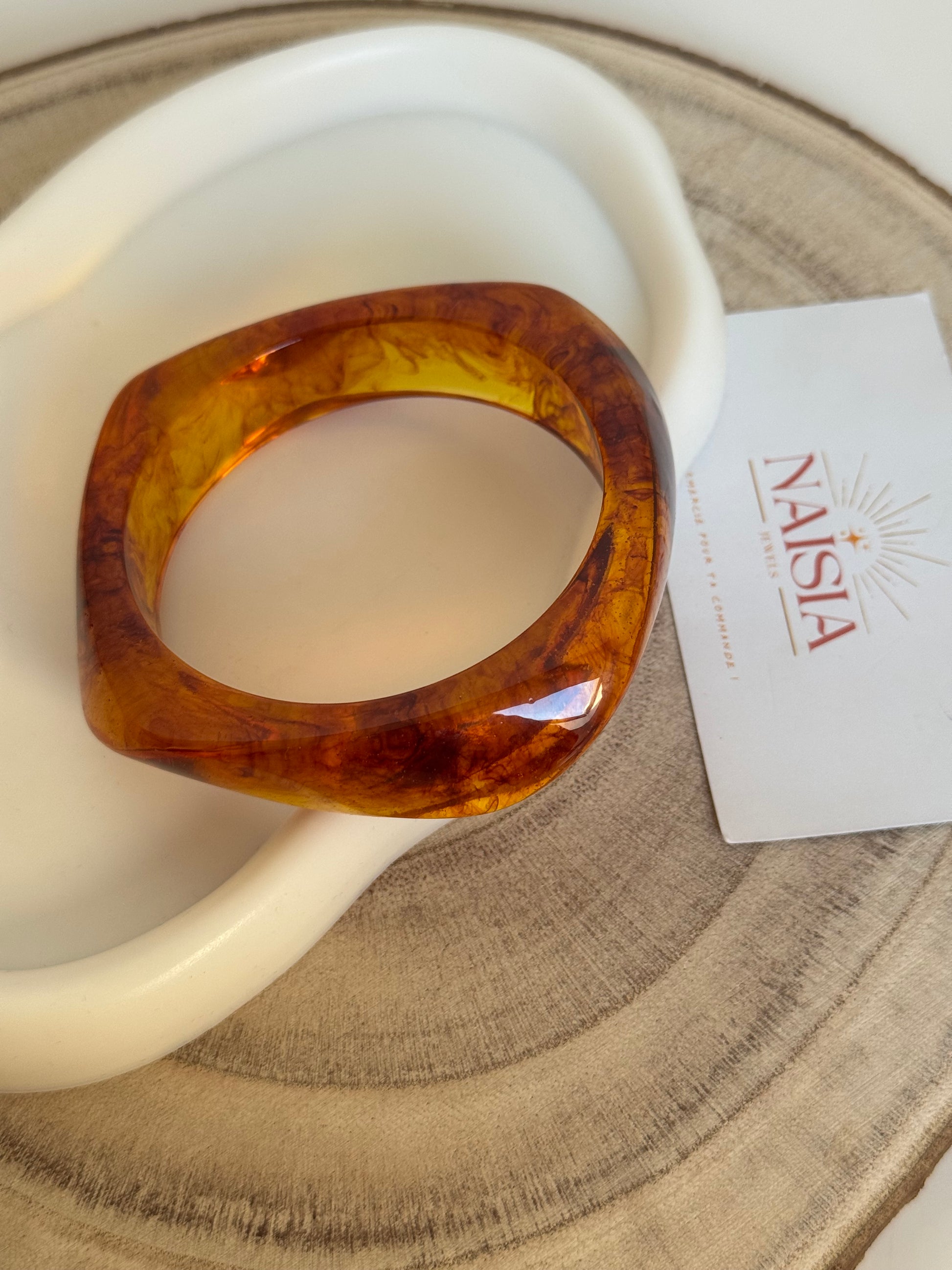 Bracelet bangle ambré translucide avec marbrures uniques. Élégance et originalité pour un style distinctif. Ajoutez une touche de mystère à votre poignet.