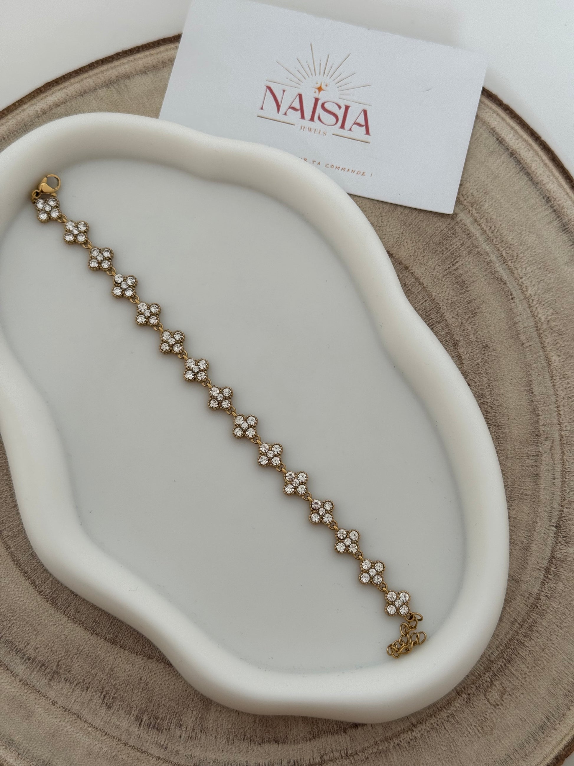 Bracelet en acier inoxydable doré orné de trèfles à quatre feuilles étincelants. Élégant et porte-bonheur, il est parfait pour ajouter une touche de brillance discrète à votre quotidien. Ajustable pour un confort optimal.