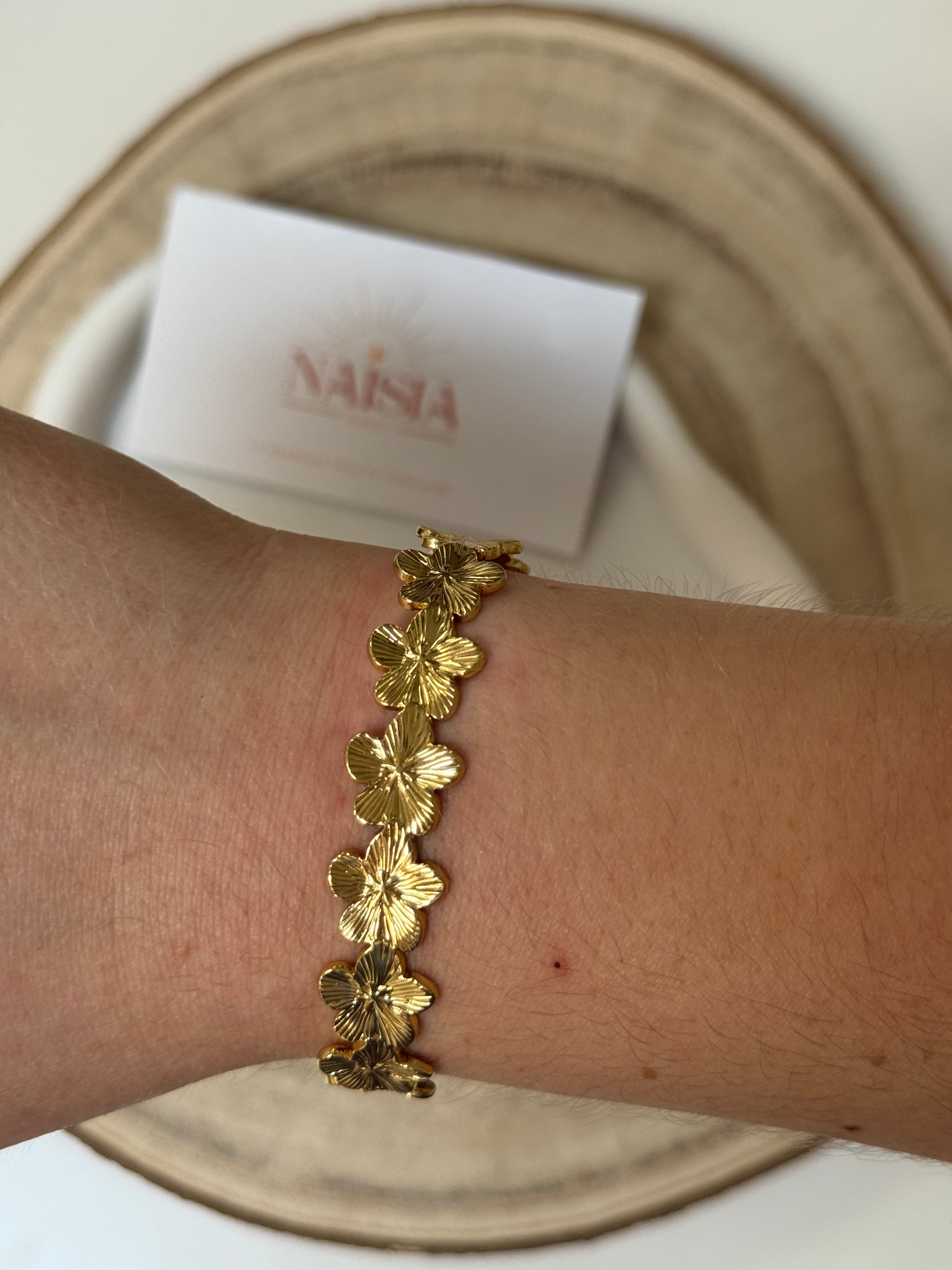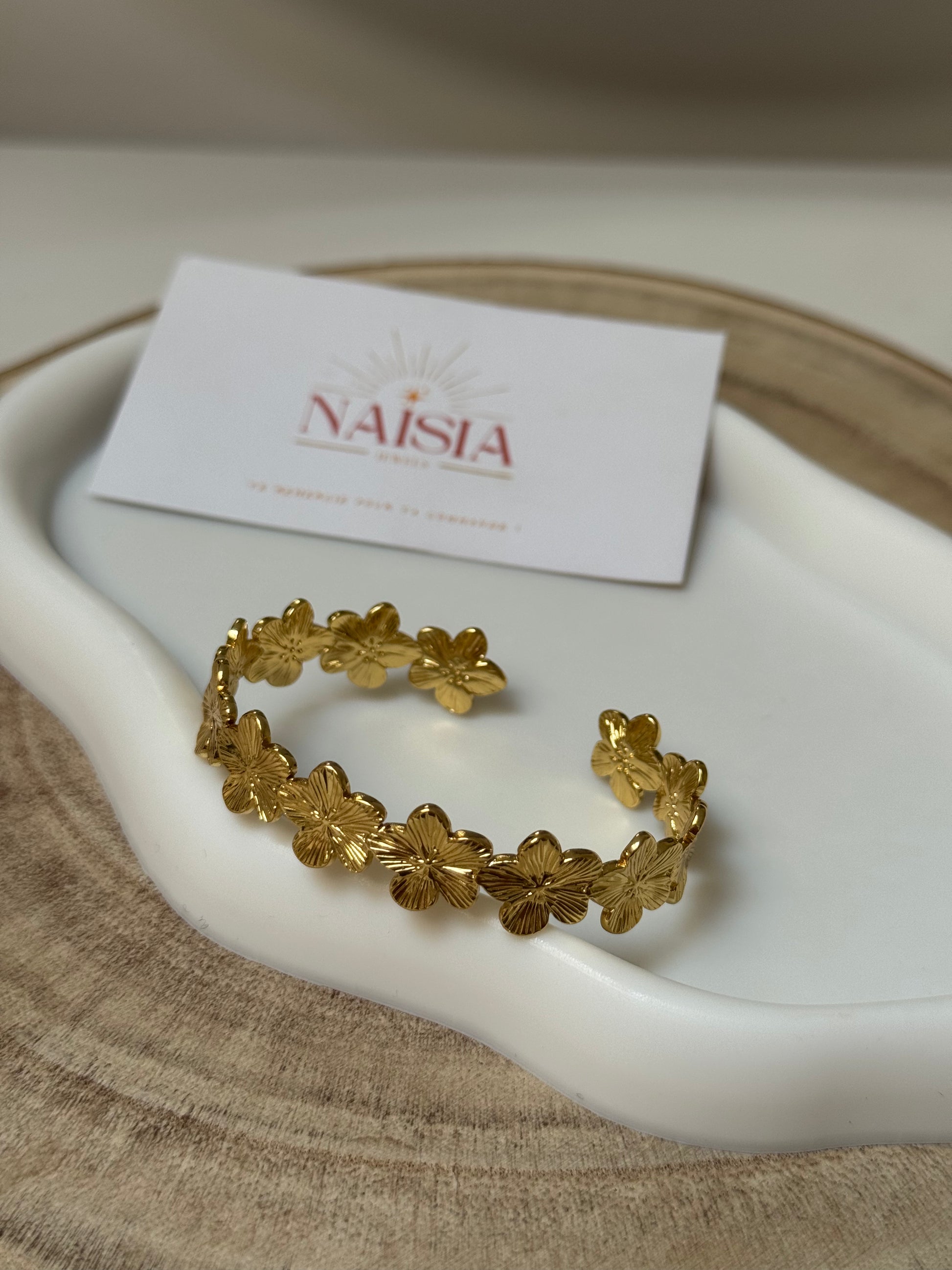 Le jonc Capucine habille le poignet de petites fleurs dorées.